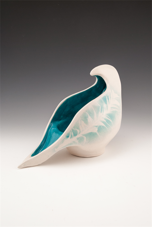 | Description: | For this piece, a combination of throwing in order to allow the round shape of the belly, paired with hand building in order to form more defined points and edges were used. A bowl-shaped bottom was thrown while two identical slabs were used to help create the silhouette of the bird, being supported by another back slab that curls around to form a beak and back. Once the bisk fired, the inside was painted on in 3 coats of underglaze. The feather pattern on the outside was created using a wet feather that was placed on the piece and then airbrushed over with the same turquoise underglaze as the inside. After the turquoise was applied to the inside as well as the feather pattern, a high fire glaze called "Ice" was then airbrushed onto the piece, giving it a more glossy finished look. |