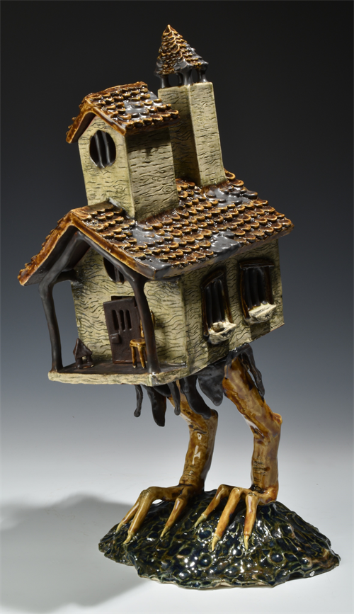 | Description: | This piece portrays the house from the Slavic myth about Baba Yaga, a cannibalistic witch that resides in a house standing on bird legs. The piece plays with the idea of having a scary, intimidating outside, when on the inside there are bright colors and warm lights. |