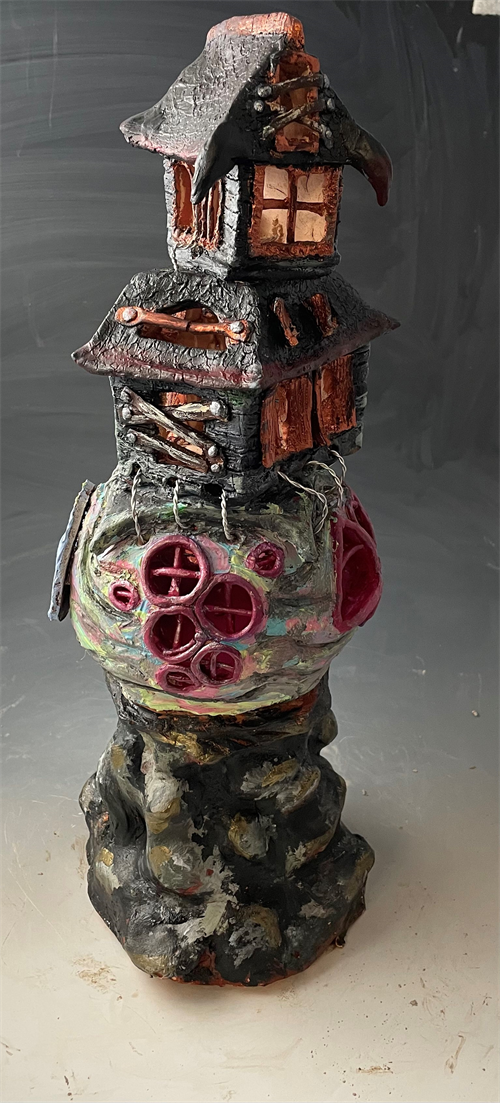 | Description: | This house is an abstract representation of my idea of home. It is a personal journey of mine; the house resides on a mountain, representing independence but maybe also loneliness. Then the base represents my childhood home, full of imagination, light, and childhood happiness as represented by the colors and structures. It is childhood innocence. However, because of my experiences growing up, the rest of my childhood home seems to have been cut short or ripped off, and a more haunted-looking, dilapidated top part of the house is stitched on. The haunted part of the house represents me growing up, being exposed to more of the dark parts of the world and even more loneliness inside and outside of my home. |