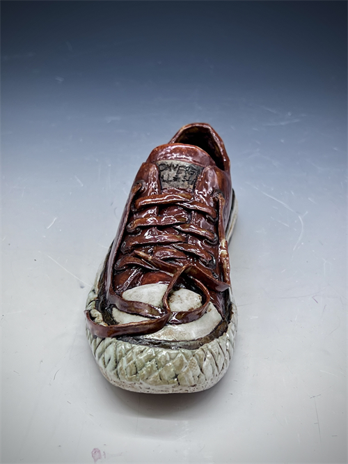 Description: Slab Built sculpted shoe. Sculpted and textured. Iron oxide and glaze. Fired to cone 6