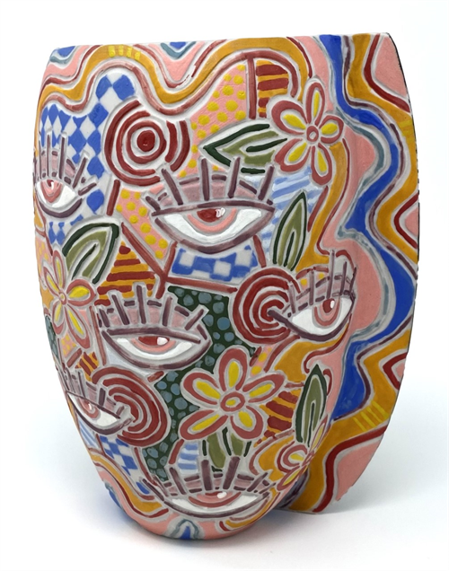 | Description: | Slip cast multiple forms offset, hand painted design Amaco Velvet underglazes, sgraffito, cone 10 reduction, toshi porcelain slip |