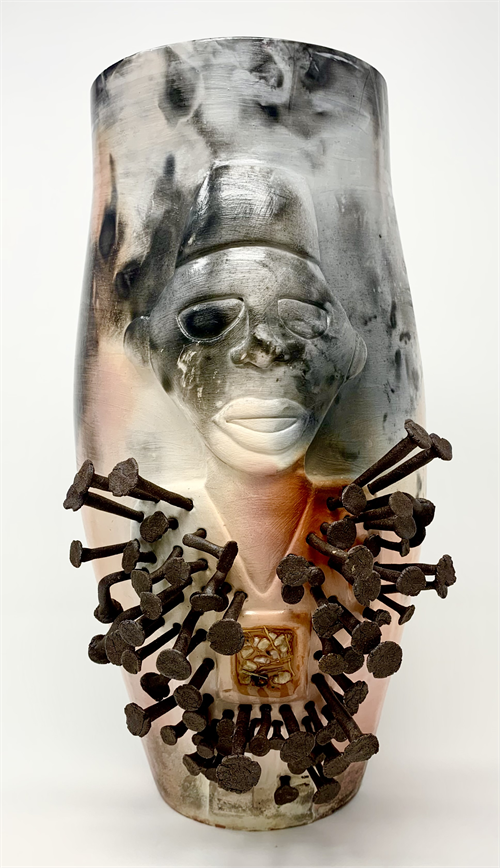 | Description: | Wheel thrown, hand carved Nkisi figure, saggar fired, dark brown clay used to make nails cone 10 reduction |