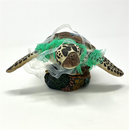 | Description: | Hand built, Amaco velvet underglazes, b mix w/grog, sea turtle, epoxy, poop can holder, netting |