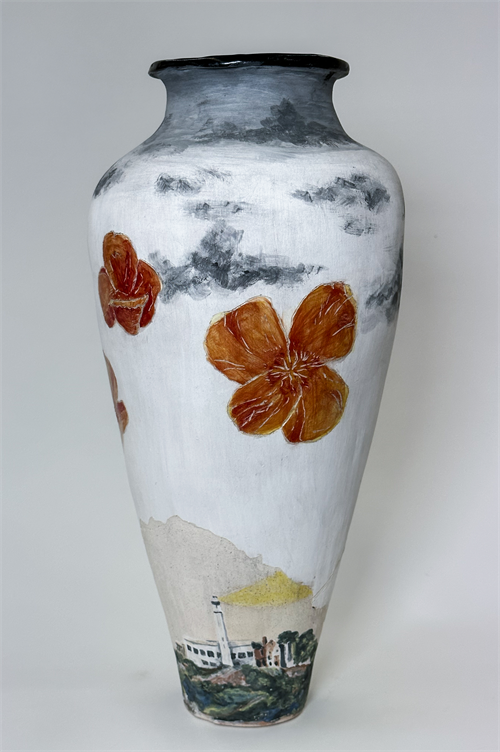 | Description: | 45 minutes North is a coil built vase, based on a 16th Century Chinese form. The underglaze and glaze design symbolizes memories of day trips with my family to San Francisco. The three California Poppies represent my siblings and me. |