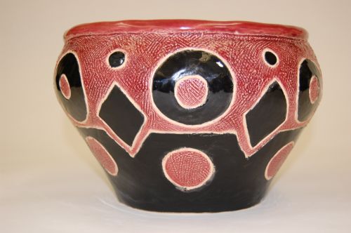 | Description: | Burgundy, black and tan bowl with geometric pattern. |