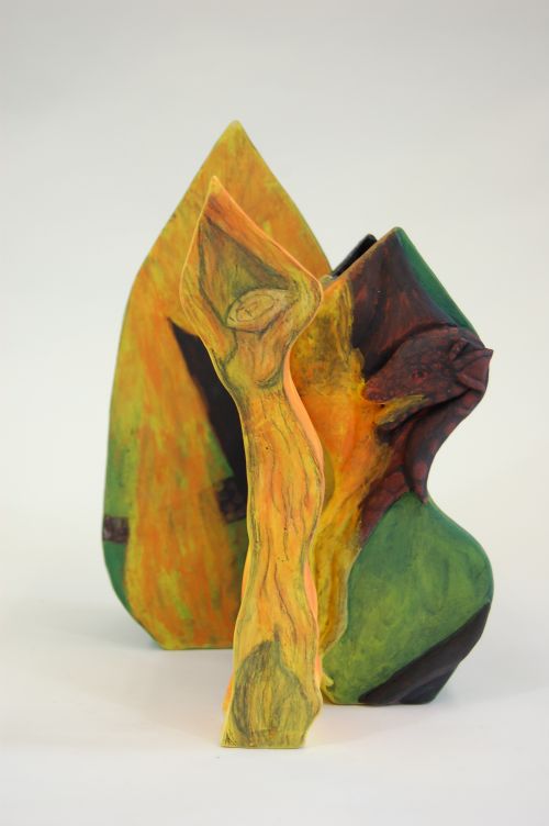 | Description: | Set of three slab vases with designs of a dragon and woman. Glazed in black, yellow, orange and green. |