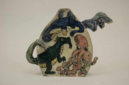 | Description: | Curved slab vase with 3D extensions (wing, tail, tentacle) and drawings of creatures. Vase is white with black stain and creatures are multi colored. |