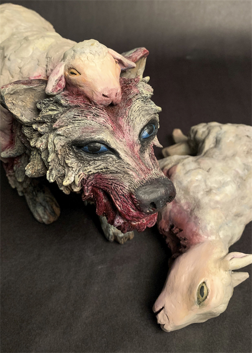 | Description: | The piece was hand built using white earthenware clay. The surface treatment was done using acrylic washes. The inspiration of the piece is a wolf in sheep's clothing to represent that people can disguise themselves as someone that you can trust but really just wants to cause harm. |