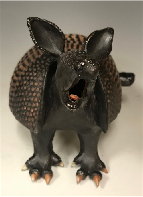 | Description: | The Singing Armadillo is a delightful and functional seven hole ocarina. It is hand sculpted and textured to anatomical specifications, with velvet underglaze stains and patinaed with an atmospheric cone 10 soda kiln. |