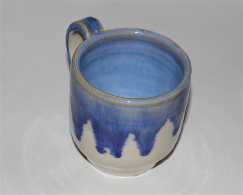 | Description: | Coffee Cup with clear glaze, top dipped in blue glaze to create drip effect. |