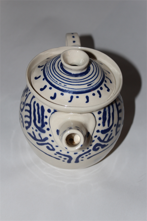 | Description: | Teapot created with both wheel and hand built elements. Clear glaze on Bmix clay with hand detailing in blue glaze. |