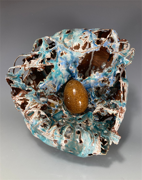 Description: A wall-hanging work made from a slip-casted egg and a collapsed sphere made from yard dipped in slip.Cone 6 - Stoneware