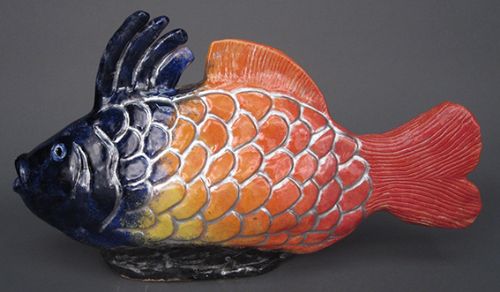 | Description: | Additive pinch, carved, under & over glaze, metallic paint, earthenware fired. This fish symbolizes the Journey of my family to produce a better life here for my generation & the ocean they had to cross to come to the United States from Jamaica. |