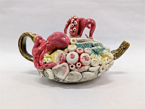 Description: A teapot decorated in various coral forms. The top rows of coral are more colorful and the color fades as the coral approaches the bottom of the pot. The teapot is meant to bring awareness and start a conversation about the collapse of the coral reefs in the ocean.