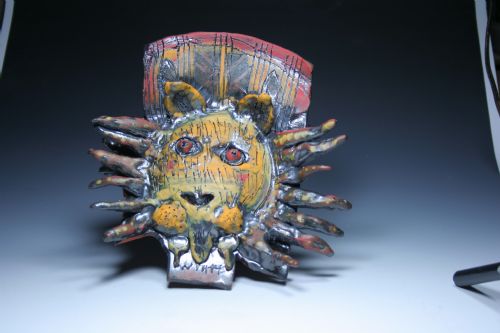 | Description: | Slab buile earthenware mask inspired by African dance masks. Colored with underglazes and black glaze wash fired to ^04. |