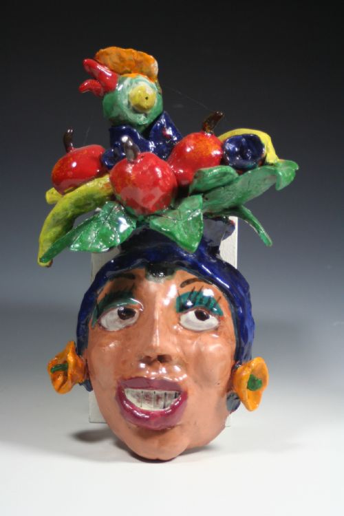 | Description: | Slab built earthenware mask inspired by movie star Carmen Miranda. Colored with underglazes and finished with a black glaze was and fired to ^04. |