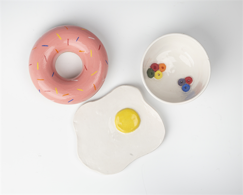 | Description: | The egg and bowl are made from hand-built and thrown porcelain. The donut is a thrown stoneware piece. All pieces feature painted stroke and coat designs. Measurements are taken of Donut. |