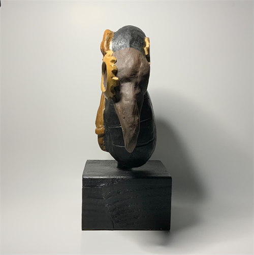 Description: Ceramic dragon creature bust on a wooden stand underglazed to create a rustic surface.