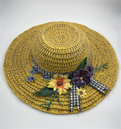 | Description: | Ceramic Straw hat made using Trompe l'oeil technique. Sculpted with coil building and indented with a wooden tool to create the slightly organic and realistic pattern. To model after the real straw hat; I added clay gingham ribbon and colorful flowers to add as embellishments to the hat. Tested multiple glazes to match the colors of an authentic straw hat. |