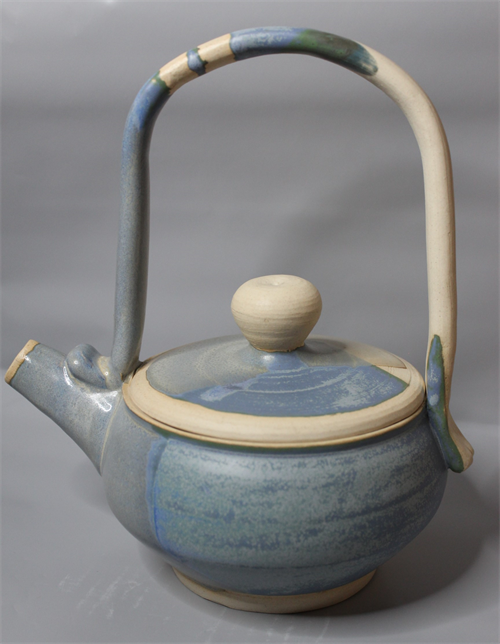 | Description: | Teapot thrown on wheel with white stoneware clay. Spout and lid were also thrown on the wheel and then trimmed and fired. Cross dipped with Castile Blue and Birch glazes. |