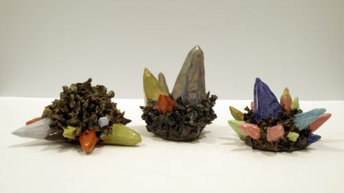 | Description: | A triad with each piece consisting of long, multi-colored shapes jutting out of the body of the work, glazed in an earthy, greyish-green glaze. |