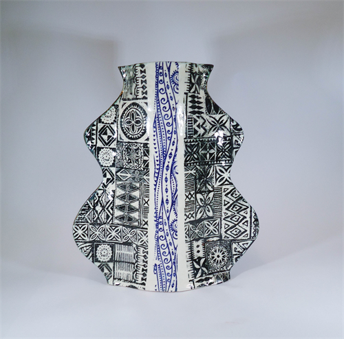 | Description: | Slab built vase with underglaze transfers of stylized waves and cloth patterns. Gold leaf on the sides. |