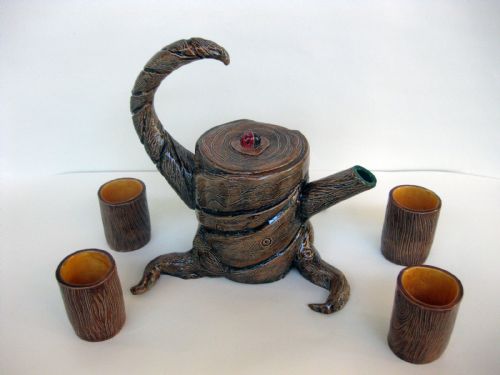 | Description: | Sculptural teapot with four matching cups. Stoneware, moulded and carved |