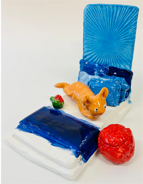 | Description: | Amelie hoped to show how smart and fun cats are. She tried to make the bedding look a little softer, through her use of glaze, creating imperfect edges.. .Amelie also experimented with press molds to create pattern and texture |