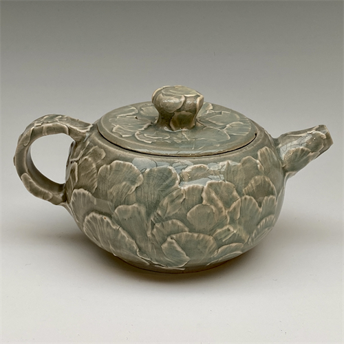 | Description: | Thrown teapot with textured slip.. Clear glaze over the slip. High-fired in a gas kiln. From the artist: My inspiration for this piece came to me one day while walking in the forest around campus. I kept seeing shelf fungi growing on trre back and fallen branches. The pattern they created gave me the idea of using slip, a thin form of clay, to create similar patterns on a piece. Using this technique on a teapot felt really important to me as I forage for a lot of the tea I drink. |