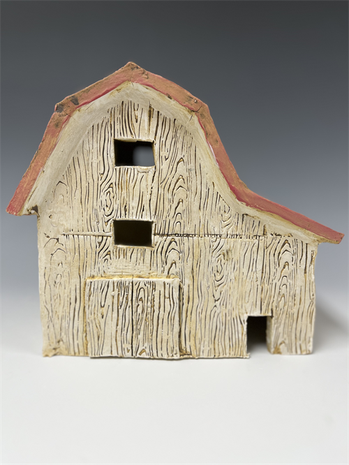 | Description: | This barn represents a bunch of barns that you see around Nebraska. If you cruise around this is the main structure and shape of a lot of the barns and I wanted to represent this through a ceramic sculpture. |