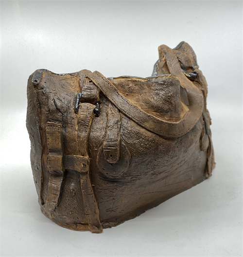 | Description: | Coil and slab built ceramic leather bag textured with handmade stamps. The bag is decorated with brown underglaze, with a metallic glaze for the buckles and zipper. Fired to cone 6. |