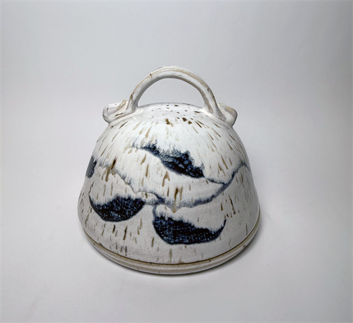 | Description: | Wheel thrown butter keeper with hand built handle. |