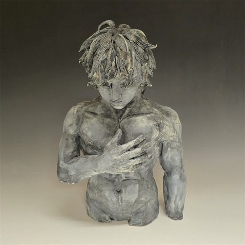 | Description: | Figure sculpture from the thighs up, colored in gray and black. |
