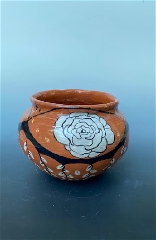 | Description: | This ceramic pot, created by Rosa in her Intro to Ceramics class, is inspired by the traditional pottery of the Acoma people in New Mexico. The piece, an "olla" pot, features delicate, organic flowers and vines that wrap around its surface, evoking a connection to nature. Rosa used red clay slip as the base color, creating a warm, earthy tone, while black and white underglazes were applied to bring her intricate design to life. |