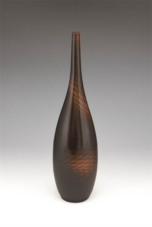 | Description: | This tall thin piece is a canvas for a special glazing technique involving an airbrush and found materials. The pattern is achieved using a stretchy mesh fabric that is held against the piece as it is dusted with a coat of glaze |