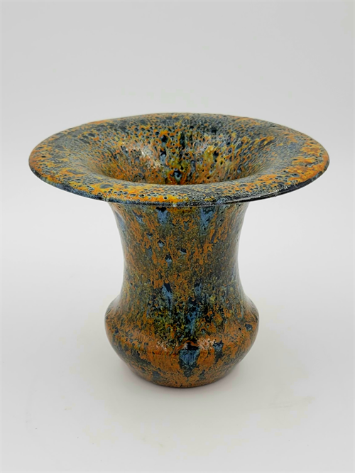 | Description: | This mid-sized symmetrical wheel-thrown vase has a bellied foot that stretches out and up to a frat rim. The vibrant glaze cascades along the smooth bell-shaped curves in yellow-brown and teal waves. The outreaching rim is the focal point and glaze pools over it in dotted puddles that flow down as the neck of the vase narrows. |