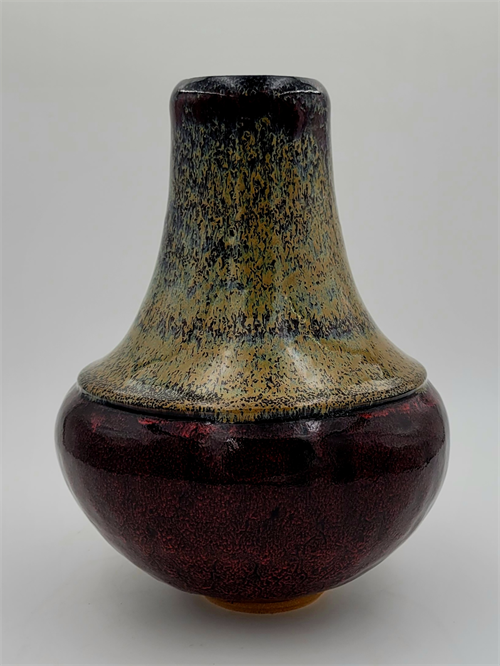 | Description: | This black-glazed vase has red bleeding over the spherical base and a wash of green over the neck. The inverted rim has pools of yellow and black glaze. |