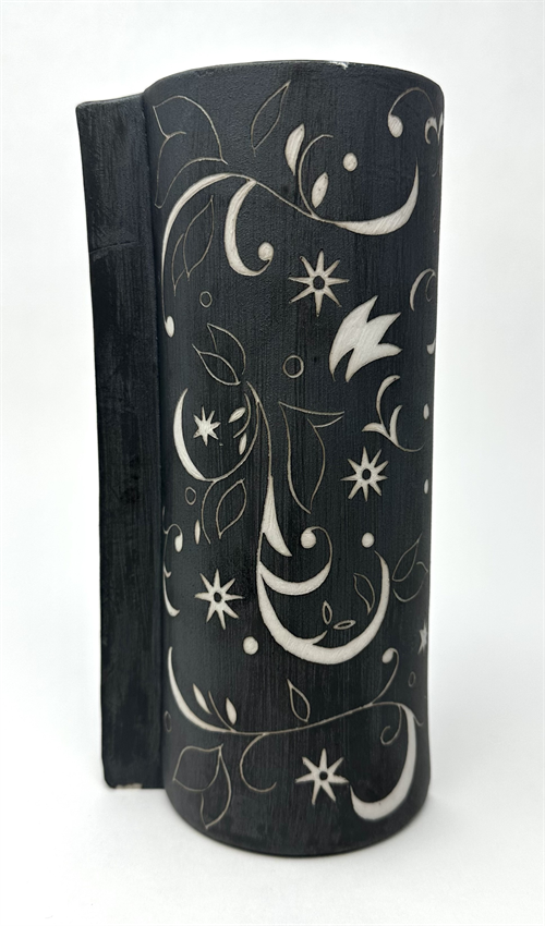 | Description: | For this piece I started out by making a mold using a glass vase. I used plaster to get the shape of the vase. I had to do it in halves so that get the shape of the vase right. After letting the plaster dry I was able to put to two halves together to create the vase shape. To get the off set shape of this vase I shifted one of the sides to change the shape. I then pored Toshi Porcelain casting slip into the mold and let that dry. Once I got it out of the mold I painted it black with an underglaze and used sgraffito to get the design. |
