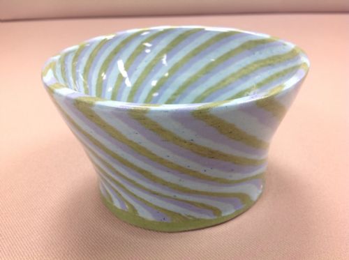 | Description: | Three different clay stains were added to white earthenware clay to begin this piece. After staining the clay was rolled into thin slabs and laid out in a pattern and joined together. Next the patterned slabs were joined to form a bowl form. Lastly the hand-built bowl was placed in the wheel and thrown into shape. |