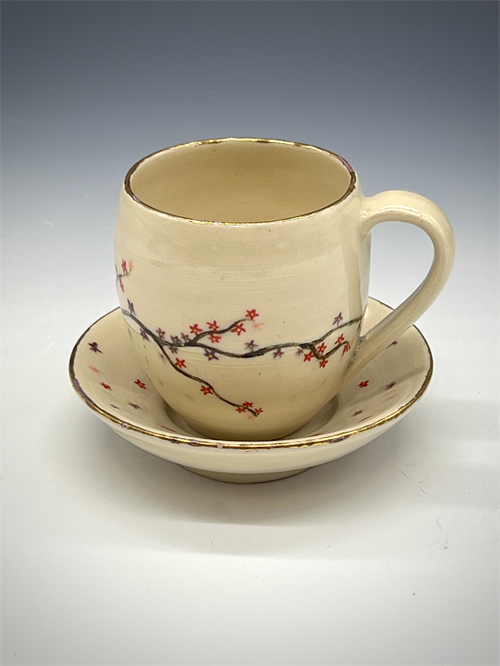 | Description: | Wheel Thrown and Trimmed Cup and Saucer with Delicate Underglaze and Luster Detailing. (Note dimensions of saucer are 4x 4 x 1- no room to add) |