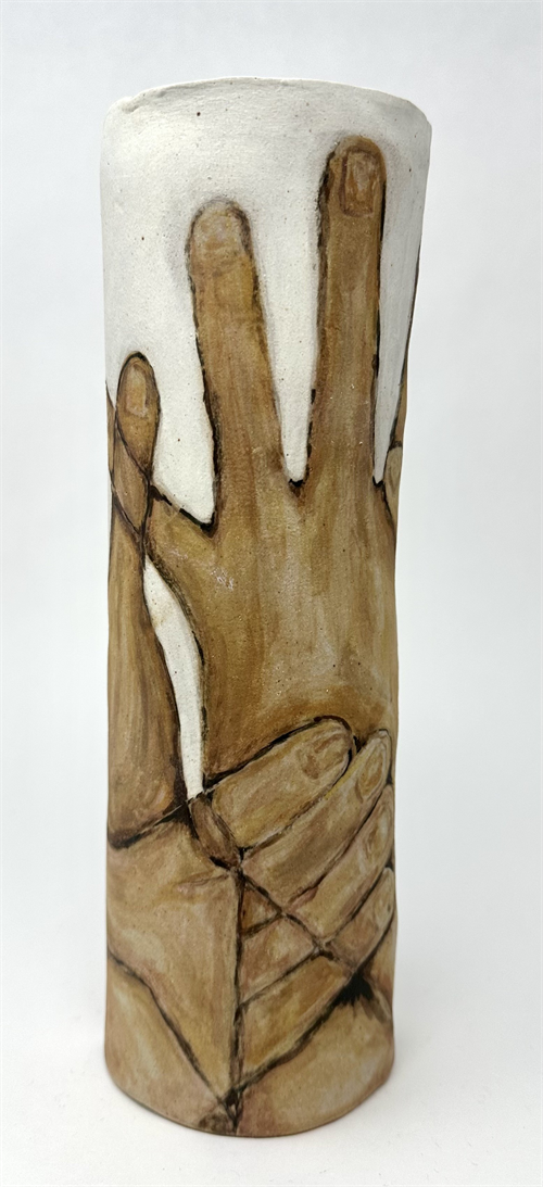 | Description: | To make the piece, I started by creating a slab of the clay. I then cut out the dimensions I wanted and pulled the cut clay into a cylinder. Once the piece was dry I drew hands on it with some parts overlapping one another. Then I went over each hand in underglaze to get the details and depth that I wanted. The meaning of this piece is reaching for perfection but never being able to reach it. The fingertips never quite reach the top of the piece showing that they don't ever reach perfection. The overlapping of the hands demonstrates how, in our attempt to reach perfection, we take inspiration from one another. It helps to show that with community and friendship we are able to reach farther for perfection. |