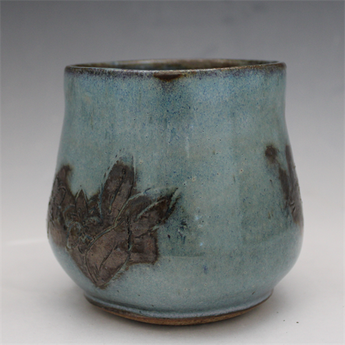 | Description: | A flower bud form with a floating glaze over jet black that parts to reveal the bas-relief floral carvings |