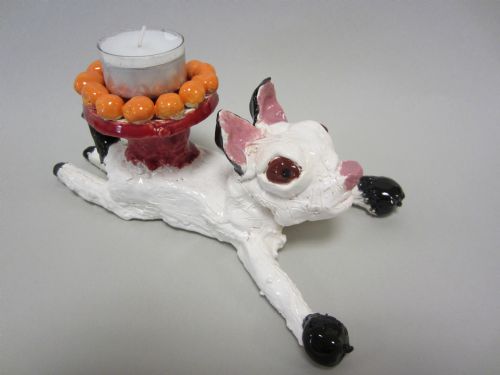 | Description: | Morgan modeled an adorable cat lying down stretching with the tea candleholder resting on its back. |