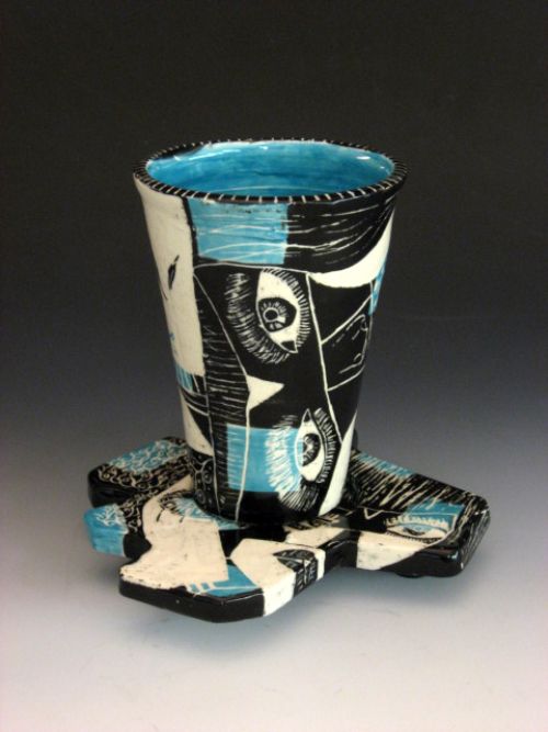 | Description: | Underglaze painted, s'graffito drawn wheel-thrown and slab built earthenware with wooden pegs. |
