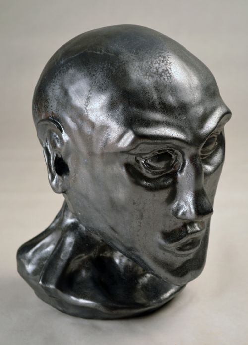 | Description: | Carved stoneware head with metallic glaze over underglaze |