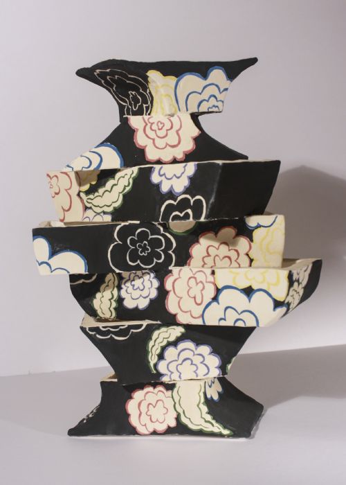 | Description: | Deconstructed vase with rotating parts. Painted black with floral patterns |