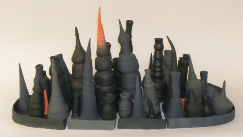 | Description: | Various small thrown cylinders arranged on plates. Tonal navy underglaze with orange details |