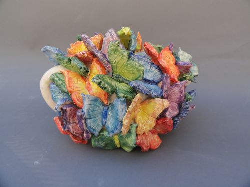 | Description: | Handbuilt stoneware teapot with individual press mold buterflies attached to teapot, underglaze detailed brushwork, clear glaze fired to 04 oxidation. |