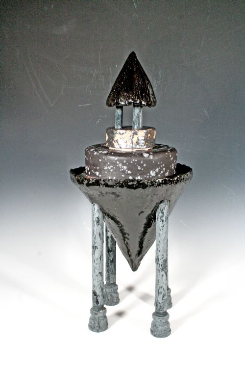 | Description: | Conical stoneware vessel (cone 06) with removable top and middle sections, steel pipe, commercial glazes and underglazes. |