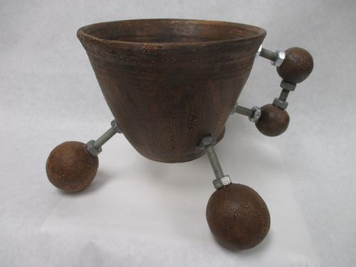 | Description: | Red cone 05 earthenware, Thrown form with hand built hollow balls for the feet and handles. The clay balls were made from rubber balls which were cast in plaster to get 1/2 of the ball form. The balls were then created by press molding the clay into the mold and then assembling the 2 halves together. Metal bolts and screws were added to support the form. Glazed |